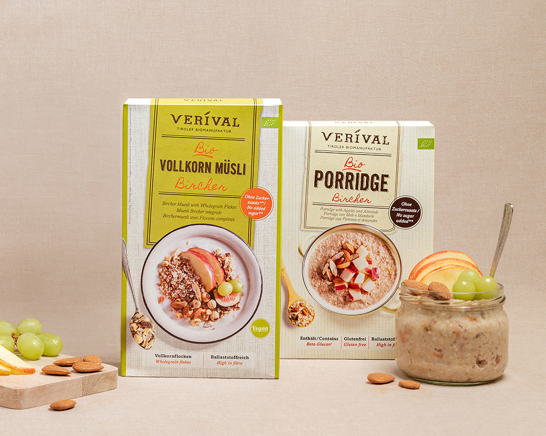Bircher Müsli neu interpretiert – Bio Vollkorn Bircher Müsli und Bircher Porridge von Verival