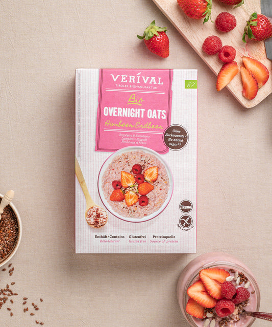 Eine Person sitzt auf einer Decke in den Tiroler Bergen, hält ein Glas mit Porridge in der Hand und lächelt. Auf der Decke liegen eine Schachtel Overnight Oats von Verival Bio und etwas Obst. Im Hintergrund erheben sich majestätisch wolkenverhangene Gipfel der tiroler Berge.