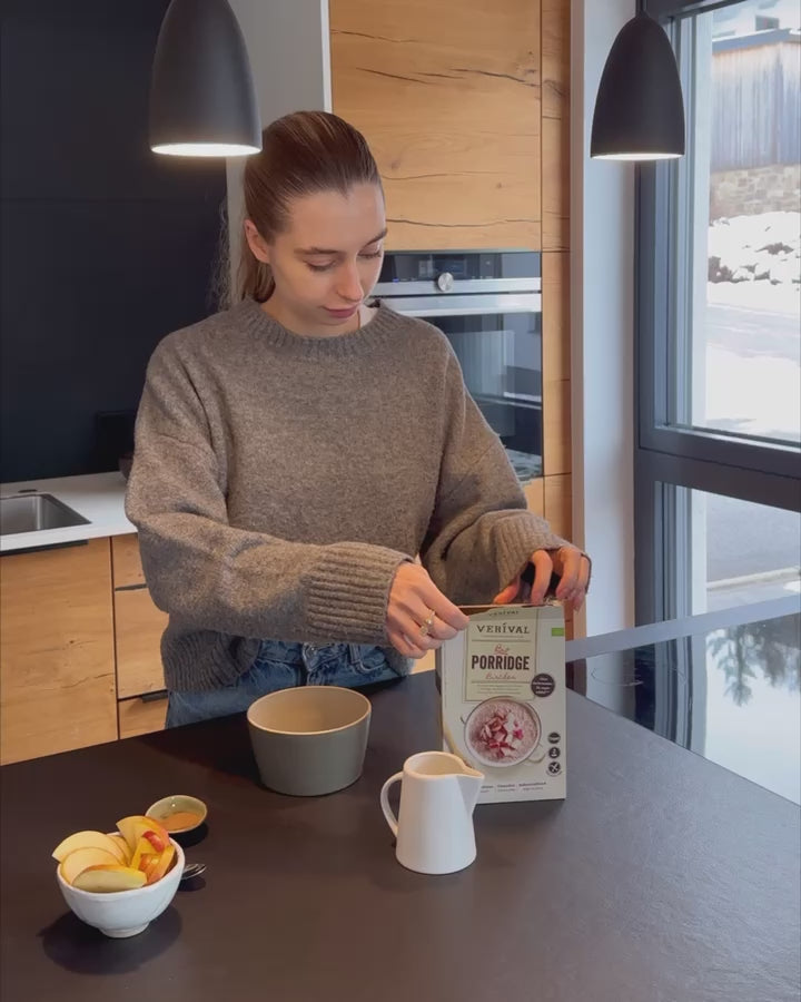 Porridge provides your body with all the important nutrients you need at breakfast time, is easy to digest and good for your immune system. The complex carbohydrates in wholemeal oats cause your blood sugar to rise only slowly, keeping you fuller for longer and preventing cravings. What's more, the fibre in wholemeal oats ensures healthy digestion. Thanks to the almonds, the porridge is a great source of vegetable proteins and provides your muscles with the energy they need. The apples it contains also provide important vitamins and minerals. By the way, our porridge is prepared in just 3 minutes, without any cooking.