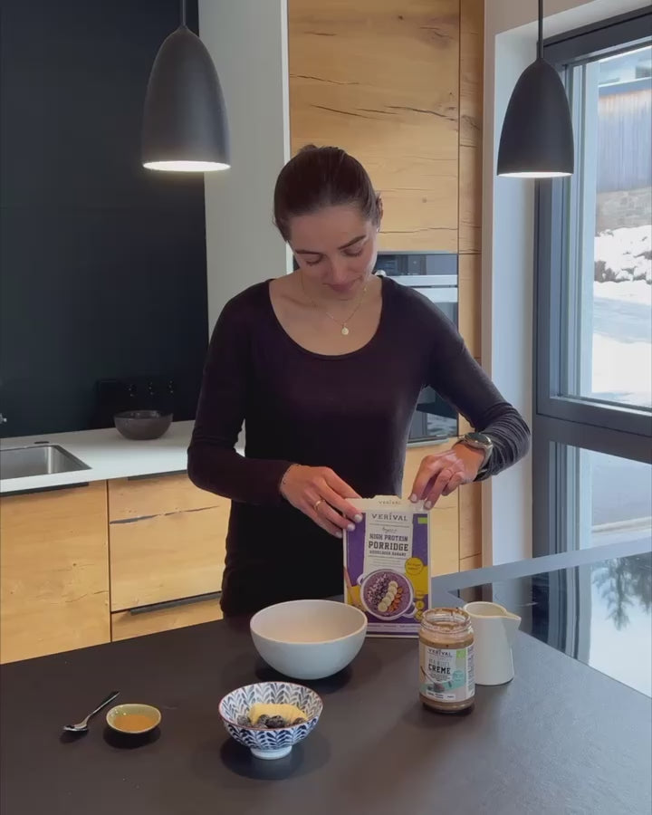 Pour 50 g porridge (6 tbsp) into a bowl with approx. 120 ml boiling water or 100 ml hot milk or plant-based drink alternative (depending on the desired creaminess) and stir. Leave to swell for 3 minutes and enjoy warm.