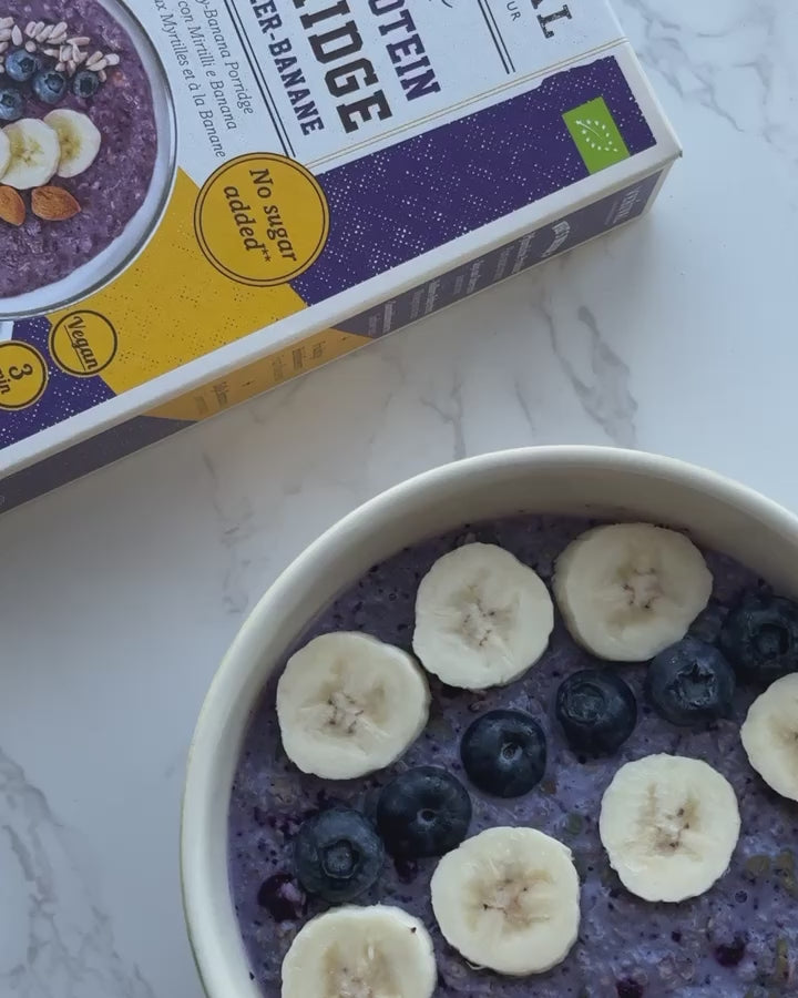 Our gluten-free high protein porridge consists of a mix of bananas, freeze-dried blueberries, hemp seeds, sunflower protein powder and soya flakes from Austria. The protein porridge can be prepared in just three minutes and provides an optimum energy supply in the morning and especially before exercise. The high protein and fibre content gives you plenty of strength and energy. Oatmeal is broken down slowly by the body, so it provides the best long-term energy supply during your sporting activity.