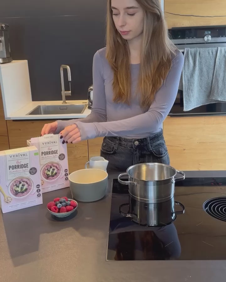 Le porridge fournit à ton corps tous les nutriments essentiels dès le petit-déjeuner, il est facile à digérer et bon pour ton système immunitaire. Les glucides complexes de l'avoine complète font monter lentement ta glycémie, ce qui te permet de rester rassasié plus longtemps et ne laisse aucune chance aux fringales. De plus, l'avoine complète assure une bonne digestion grâce aux fibres qu'elle contient. Les myrtilles contiennent également des antioxydants importants qui te protègent des radicaux libres et donc des maladies. Les pommes contiennent également des vitamines et des minéraux importants. Notre porridge est préparé en seulement 3 minutes, sans cuisson.