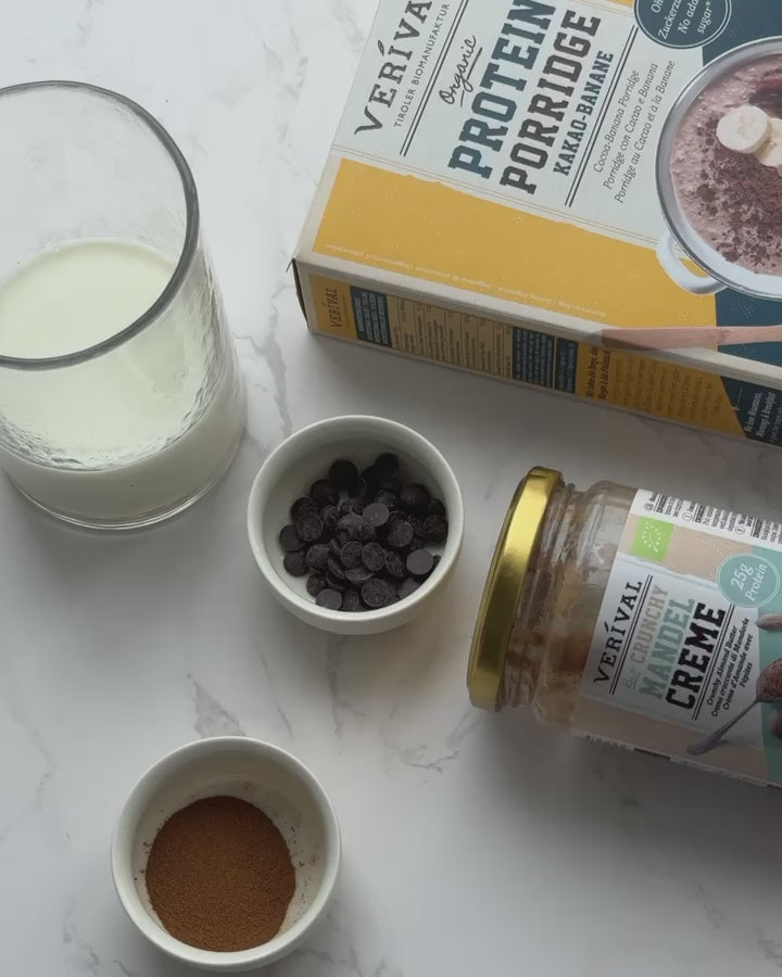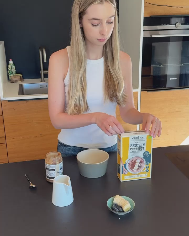 Notre porridge protéiné sans gluten pour le sport est composé d'un mélange de bananes, de dattes, de graines de lin, de poudre de maca, de poudre de protéines de tournesol & de graines de courge et de cacao. Le porridge protéiné se prépare en trois minutes seulement et assure un apport énergétique optimal le matin et surtout avant de faire du sport. En effet, la forte teneur en protéines et en fibres te donne beaucoup de force et d'énergie. Les flocons d'avoine se décomposent lentement dans le corps, ce qui garantit un apport énergétique à long terme pendant ton activité sportive.