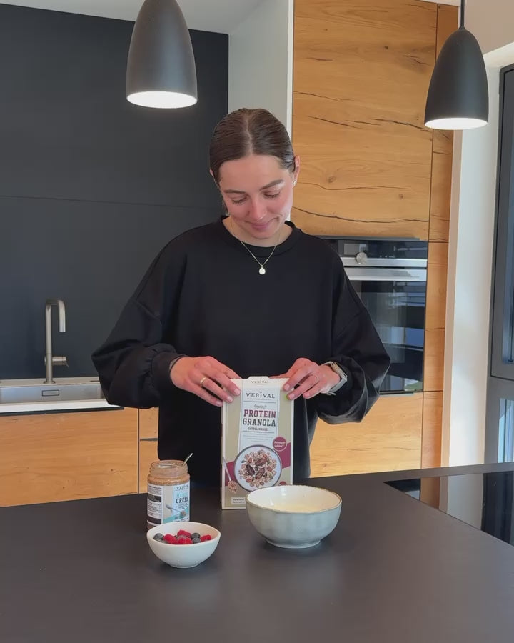 La tua colazione energetica quotidiana: 100 g di granola proteica ti forniscono il 25% delle proteine necessarie, tutti gli aminoacidi essenziali e il 37% del fabbisogno giornaliero di fibre al mattino. Inoltre, è puramente vegetale e non contiene zuccheri aggiunti.